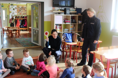Raz do roku gościmy w naszym przedszkolu panie policjantki, które przypominają dzieciom o zasadach bezpieczeństwa na drodze.