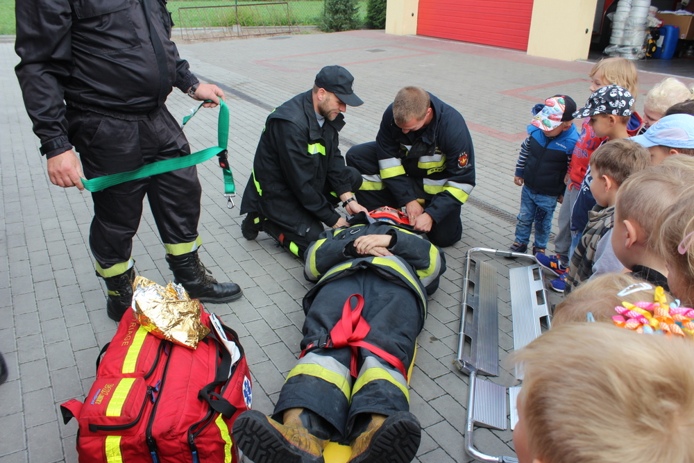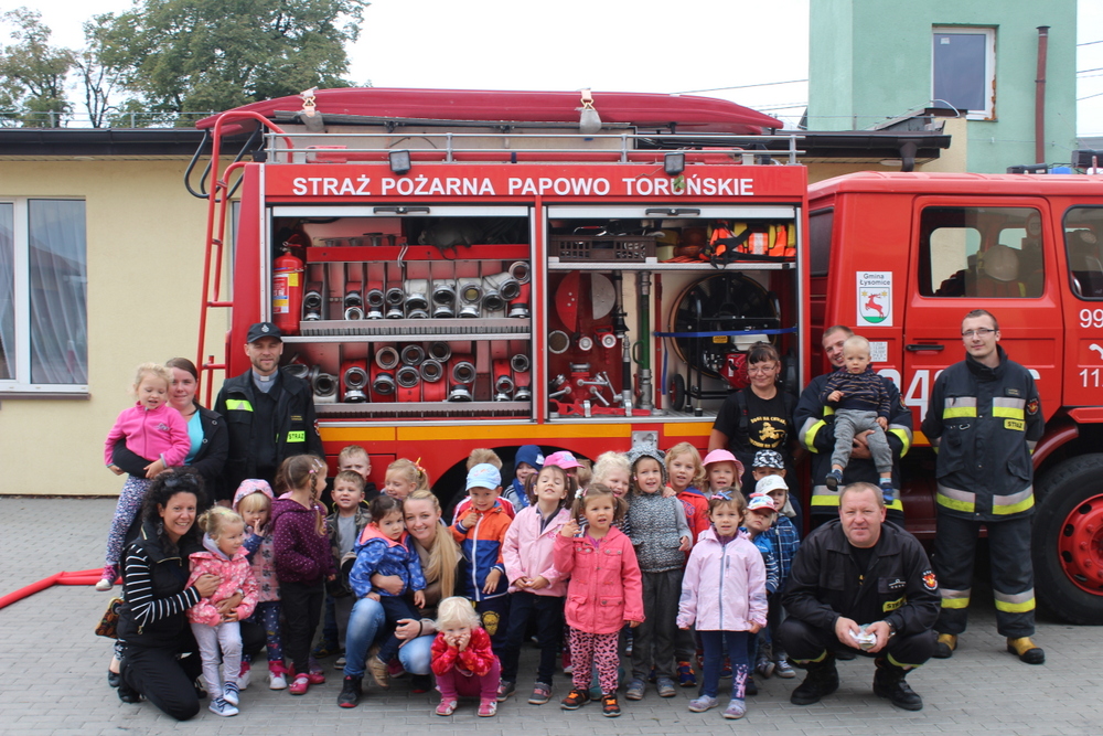Dzisiaj dzieci odwiedziły siedzibę Ochotniczej Straży Pożarnej w Papowie Toruńskim, gdzie dowiedziały się na czym polega praca strażaka. Każde dziecko miało okazję przymierzyć strażacki strój, wejść do strażackiego wozu, a na koniec lać wodę z prawdziwego strażackiego węża. Serdeczne podziękowania dla pana Henryka Kosielskiego oraz całego zespołu Ochotniczej Straży Pożarnej w Papowie Toruńskim za zaproszenie nas na tak ciekawe zajęcia!